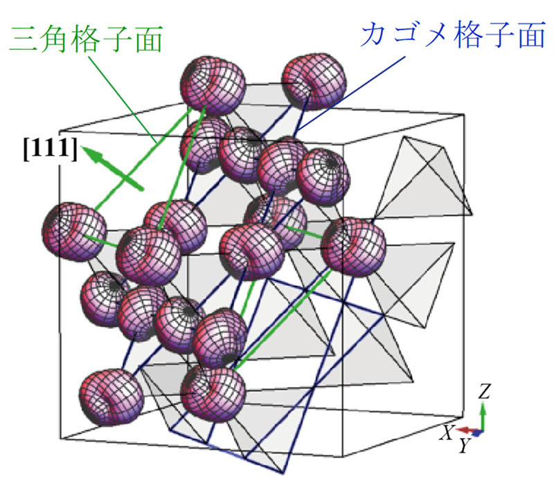 Tb 2 Ti 2 O 7 は、パイロクロア格子と呼ばれる四面体(グレーのピラミッド)が点共有で3次元的に連なった構造を形成します。四面体頂点にはテルビウムイオンが配置しており、紫色の歪んだ球は四極子秩序後のテルビウムイオンの電荷分布を表しています。それらの周期構造が四極子秩序の構造を表します。[111]方向は三角格子面とカゴメ格子面が交互に積層する2次元構造が特徴的な方向です。