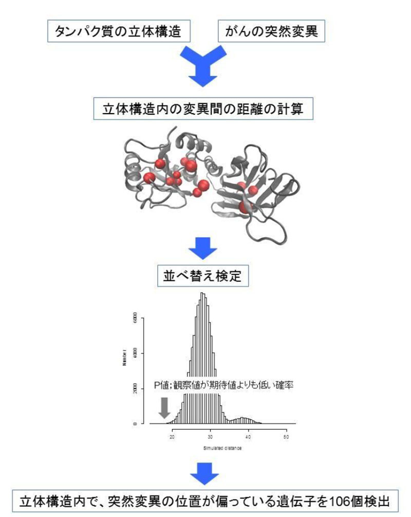 この方法では、立体構造が決定されている遺伝子について、立体構造内の変異間の距離を求め、並べ替え法(permutation法)で統計的有意性を検定します。この方法をTCGA計画で公開された21種のがんのデータに適用したところ、106遺伝子に有意な変異の偏りが検出され、ドライバー遺伝子候補と考えられました。これらのうち、約半数の遺伝子が既知のドライバー遺伝子( TP53, PIK3CA, PTEN, CDKN2A など)であり、本方法はドライバー遺伝子の検出に成功していると考えられました。