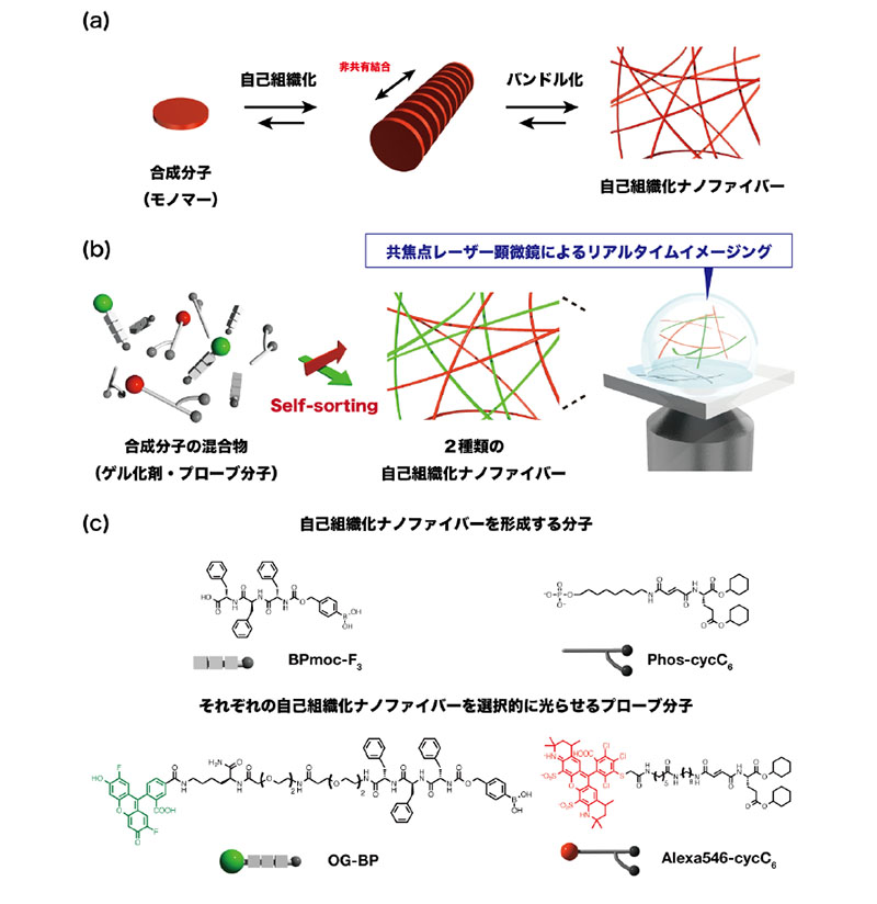 本研究グループは分子間の相互作用の違いに着目することによってこの課題を解決し、性質の異なる2種類のナノファイバーを形成する分子ペアを発見しました。また、共焦点レーザー顕微鏡を用いることで、これまで不可能であった合成分子におけるself‐sorting現象のリアルタイムイメージングに成功しました。