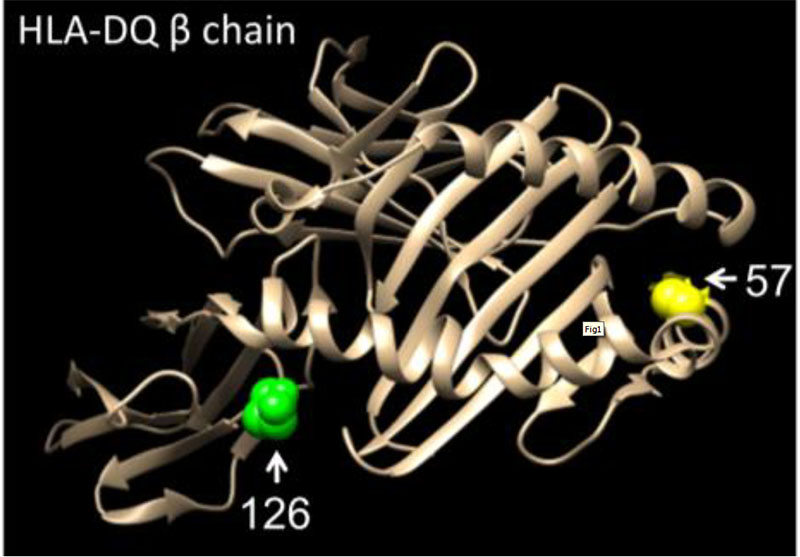 その結果、三つの遺伝子が作り出すタンパクの構造を見てみると三つの遺伝子型のうち、 HLA-DQB1 についてのみ、それが作り出すタンパクを構成するアミノ酸の場所に強い関連が二つ見られ、その内の一つは別の免疫性疾患である I 型糖尿病に最も強く関連するアミノ酸の場所と同じでした。(図参照)