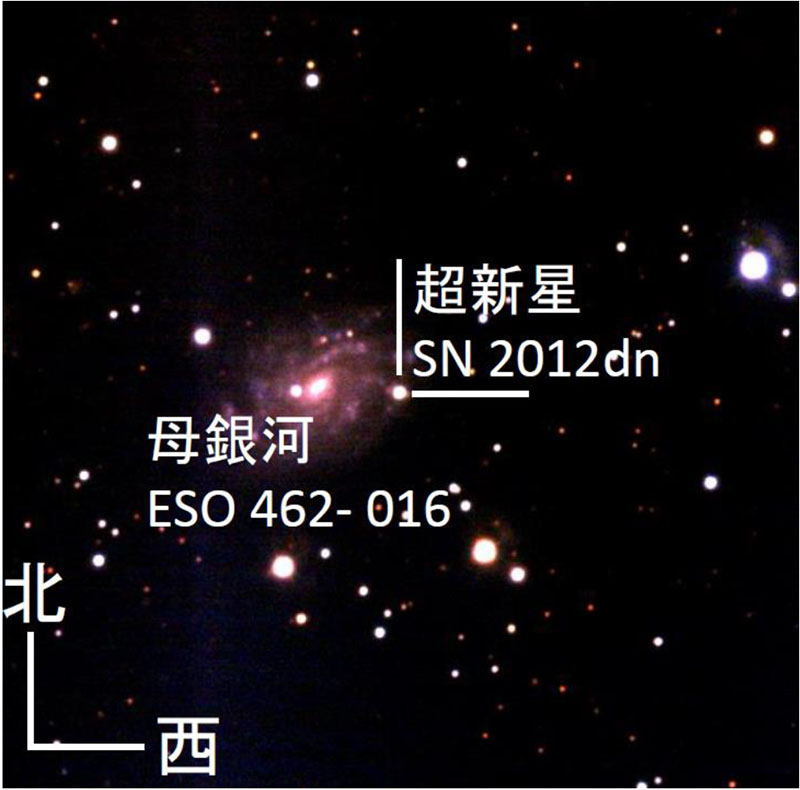 画像中央にSN 2012dnが見えています。また、超新星の存在している母銀河ESO 462-016が左側に見えています。この銀河までの距離は、1億3000万光年と知られています。超新星はただの点源で、膨張で広がっていく姿を捉えることはできませんが、明るさや色などの変化を追うことが可能です。