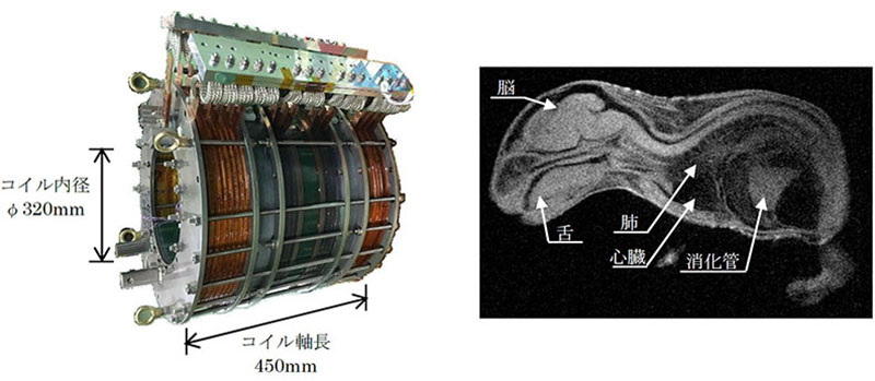 MRIミニモデル用高温超電導コイル(左)とマウス胎児の撮像写真(全長約25mm)(右)