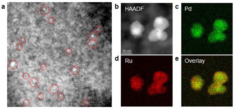 (a) HAADF-STEMイメージ赤い破線で囲まれた輝点が担持されたPdRu-NPs(b) PdRu-NPsの拡大HAADFイメージ(c) Pdの元素マッピング(d) Ruの元素マッピング(e) PdとRuの元素マッピングの重ねあわせ、ナノ粒子内にPdとRuが一様に分布しており、原子レベルで混合した固溶体ができていることが分かる。