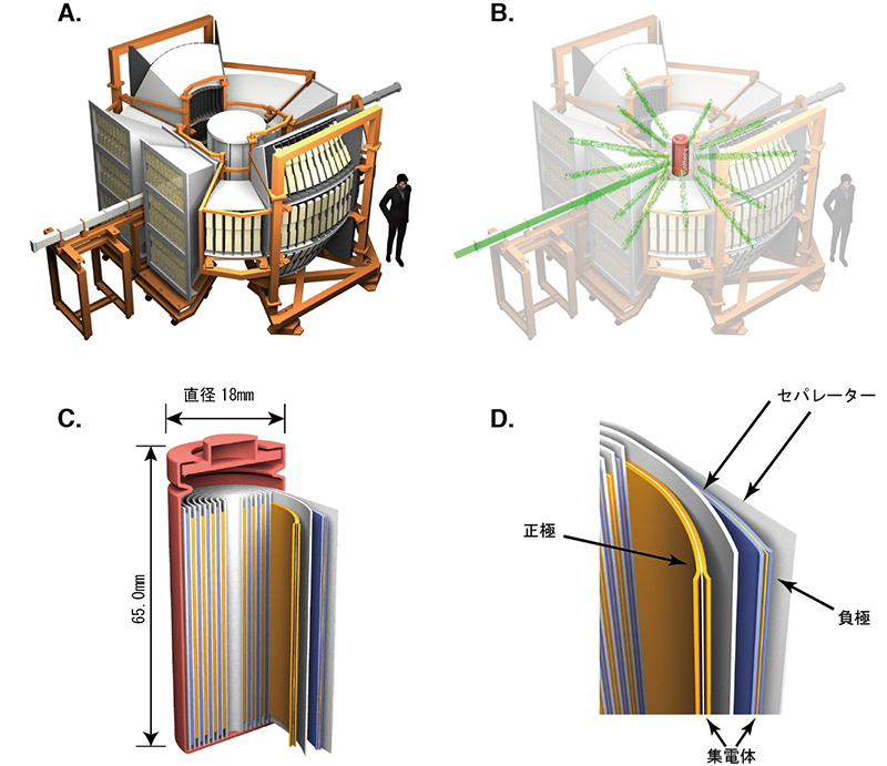 図:実用蓄電池オペランド測定用中性子回折計(BL09 : 特殊環境中性子回折計、SPICA)の外観図(A)および、実験の概要図(B)。オペランド測定は、非破壊のまま18650型円筒リチウムイオン電池(C)をSPICAの中心に設置し、電池に電気を流し充放電反応を進行させたまま、パルス中性子を照射し電池反応をリアルタイムに観測する。中性子は金属に覆われた蓄電池内部まで透過し、電極で散乱(回折)され、検出器に到達する。検出器に到達した中性子の時刻と角度をデータ処理すると、観測結果として回折図形が得られる。この回折図形には、18650型円筒電池の拡大図(D)に示すように、正極、負極、集電体、電池のケースからの固有の回折線が含まれる。これらの回折線の変化を解析することでリアルタイムな電池反応に伴うリチウムイオンを含むイオン(原子)の配列や濃度(占有率)の変化を解析できる。