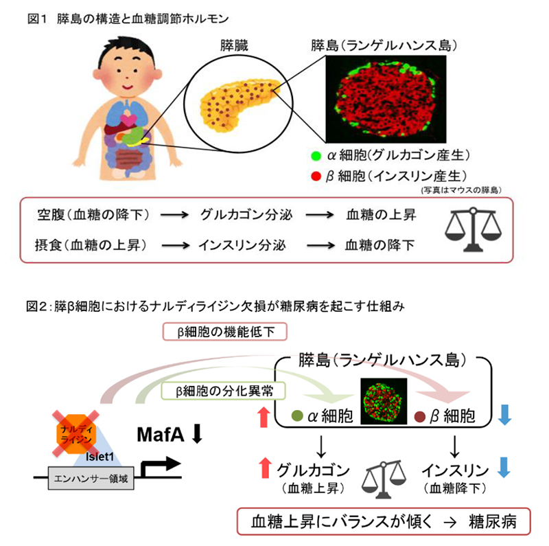 本研究グループは、ナルディライジンが全身で欠損したマウスを作製して、グルコースを投与する負荷試験を行ったり、膵島の遺伝子発現を調べるなどし、膵β細胞のナルディライジンがインスリンとグルカゴンの分泌をコントロールし、血糖値を一定の範囲内に保つことに必須であることを明らかにしました。