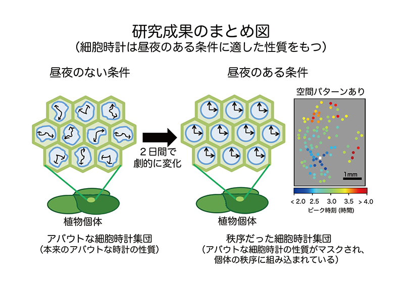- 昼夜のある条件ではアバウトな性質が一掃され、細胞時計は個体内で整然と時を刻むことを発見