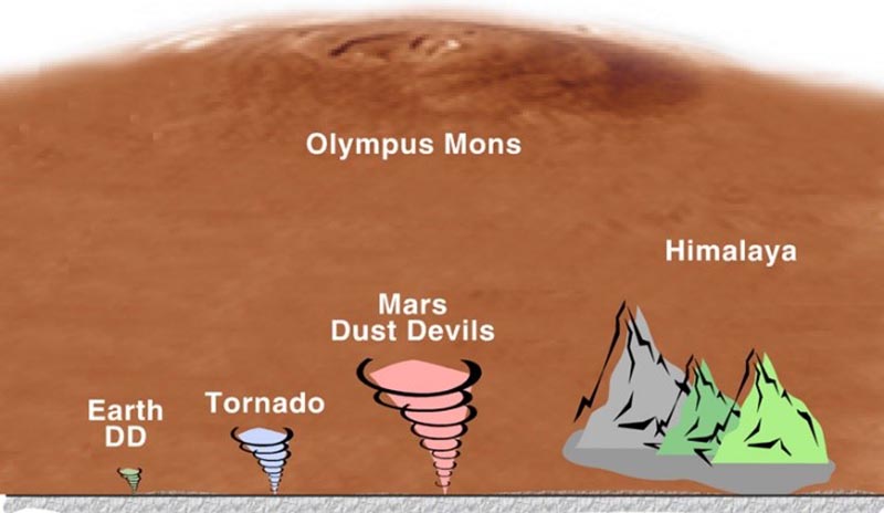 左から地球のダストデビル、地球の竜巻、火星のダストデビル、地球のヒマラヤ山脈(標高8,000 m 級)を示している。奥に見えるのは、火星のオリンポス山(火山)で標高約21,900 m 、太陽系で最も高い山として知られる。(NASA/JPL)