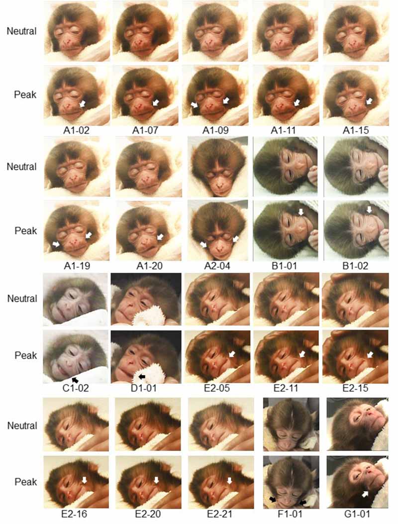 図:ニホンザルの赤ちゃんにおける自発的微笑。A-Fは個体番号、アルファベットの次の数字は観察セッションの番号、ハイフンの次の番号は各微笑のID番号を示す。Neutral:微笑前、Peak:微笑が最大になったとき