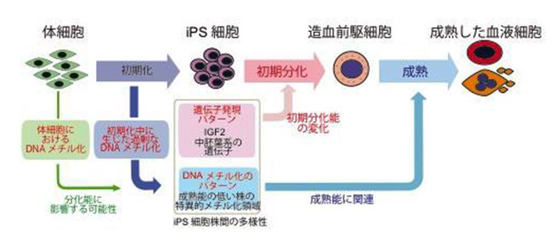 その結果、iPS細胞やES細胞のような多能性幹細胞から造血前駆細胞への初期分化には、IGF2遺伝子の発現量が影響することが明らかになりました。一方、造血前駆細胞から血液細胞への成熟能に関しては、体細胞のiPS細胞への初期化の際に起こるDNAメチル化量が影響することが明らかになりました(図)。