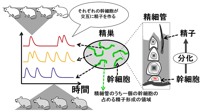 篠原隆司 医学研究科教授、篠原美都 同助教、 本田直樹 同特定准教授らの研究グループは、精巣の幹細胞が精子を作る活性には周期があること、幹細胞によっては分化の過程で精子になるものとならないものがあることを発見しました。