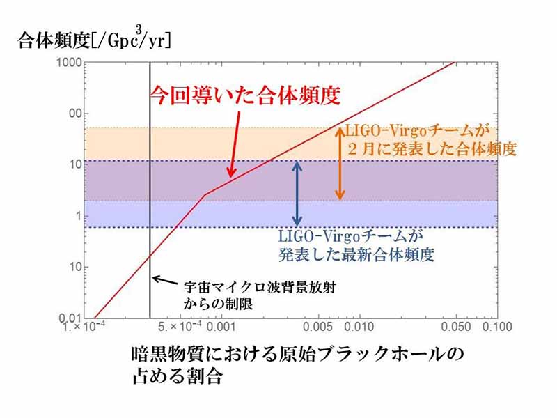 今回、原始ブラックホールの暗黒物質に占める割合が低いという状況の下で、連星ブラックホールの合体頻度を計算したところ、宇宙の暗黒物質の千分の一ほどを占めると仮定すると、予言される合体頻度が観測から決めた合体頻度と良く合うことが明らかになりました。