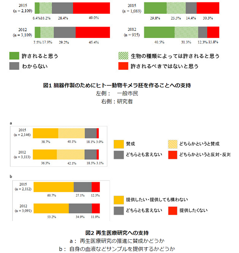図2:一方で、再生医療研究については、こうした活動自体への支持度は高く(およそ8割)、また自分自身の細胞を使って参加してみたいという人も過半を占めており、キメラ研究への反応とは対照的でした。