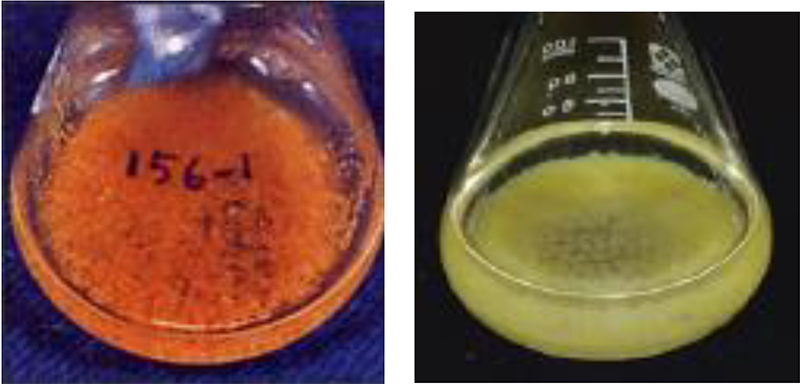 図:ベルベリンを作るオウレン156-S細胞(左)、ほとんど作らないCjY細胞(右)