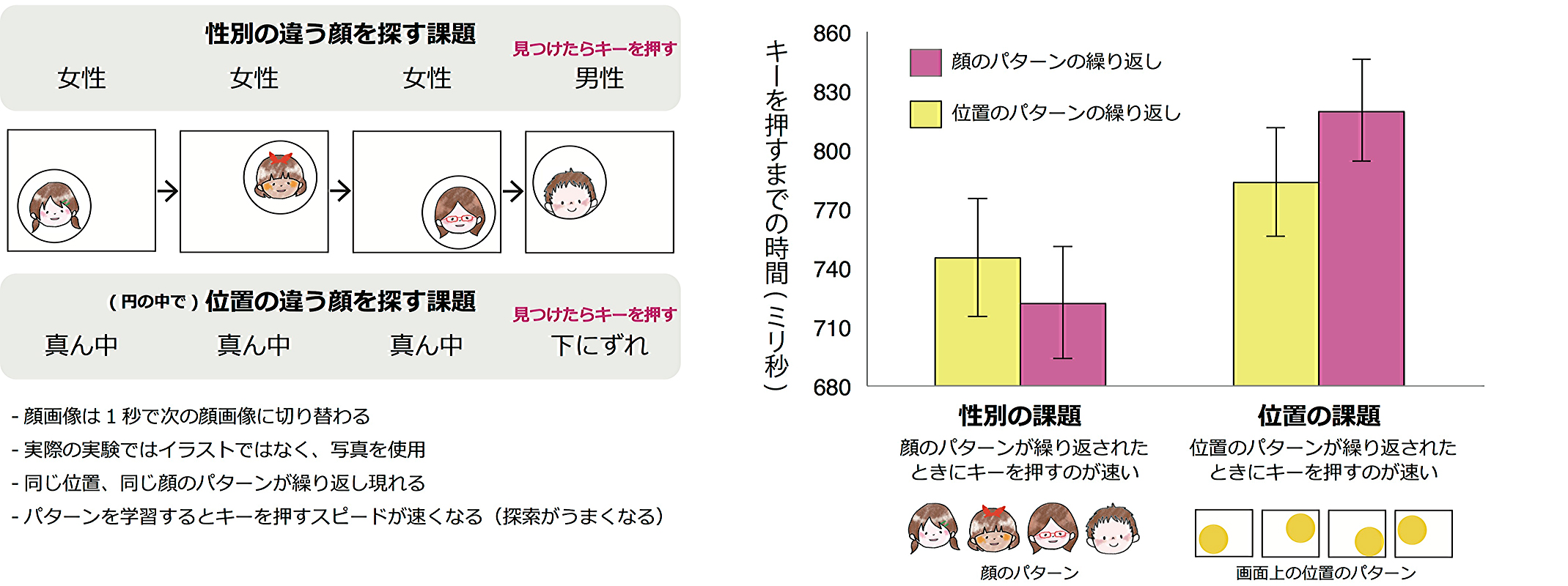 その結果、「性別の違う顔を探す」課題では、顔のパターンが繰り返されたときに顔を見つけるのが早くなる一方で、「位置の違う顔を探す」課題では、位置のパターンが繰り返されたときに顔を見つけるのが早くなりました。これらのことから、同じパターンを繰り返し見ていたとしても、行っている課題によって、潜在学習が左右されるということが明らかになりました。