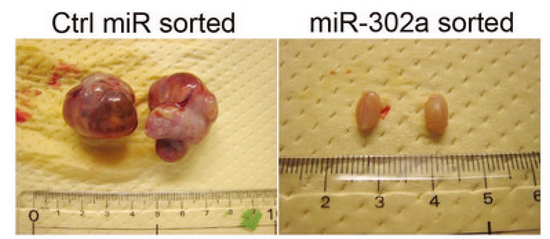 iPS細胞と神経細胞の混在した細胞集団に、miR‐302に応答しないコントロールmRNAを導入すると、移植したマウスの体内で奇形腫が形成される(左)のに対し、miR‐302スイッチを導入し、iPS細胞集団を除去した場合には、奇形腫が形成されない。(右)