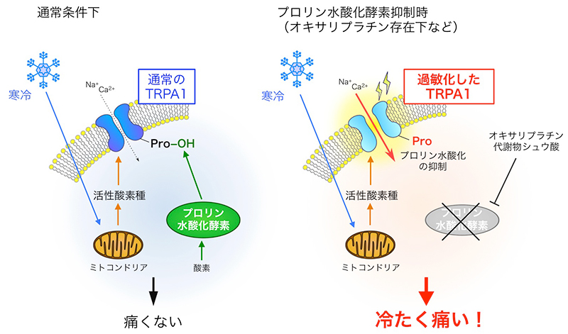 本研究グループは今回、オキサリプラチンの副作用が実際にがん治療中の患者で生じることを手掛かりにメカニズムをさらに詳細に解析しました。その結果、オキサリプラチンがプロリン水酸化酵素という酸素依存性の酵素活性を抑制し、正座後のしびれと同じような環境を作り出すことによりTRPA1が非常に敏感な状態となり、冷刺激によってわずかに発生する活性酸素と呼ばれる生体内の刺激物質がTRPA1を刺激することで、「冷たさ」を間接的に「痛み」に変換していることを明らかにしました。