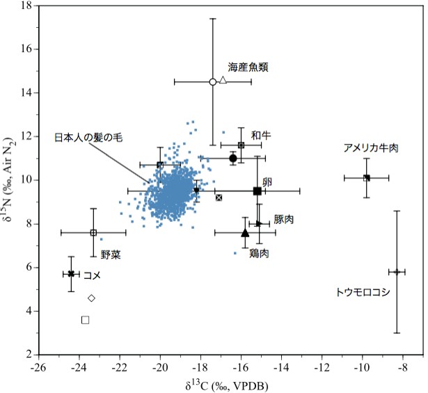 日本人の髪の毛の炭素・窒素同位体比と、食品の同位体比