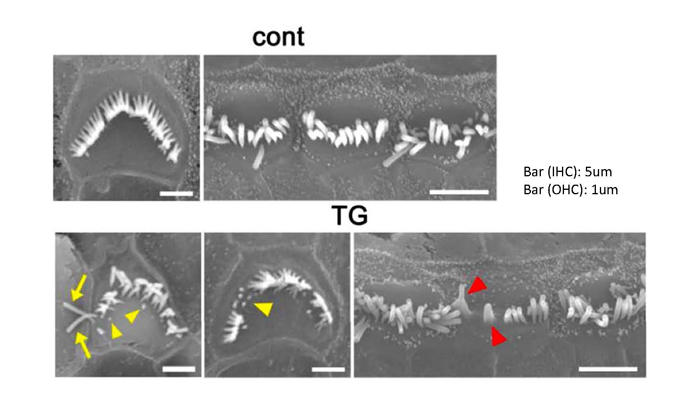 図:難聴患者病態を再現する遺伝子操作マウス(TG)の聴毛の電子顕微鏡像