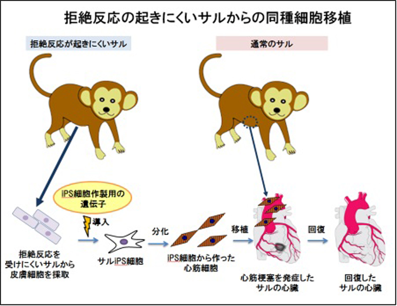 拒絶反応が起きにくいカニクイザルを同定し、このサルからiPS細胞を作製した。次に通常のカニクイザルに心筋梗塞を発症させ、カニクイザル同士(同種移植)で心筋細胞移植を行った.。