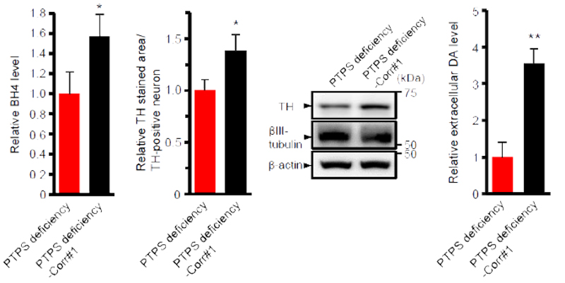 それらのiPS細胞をドパミン神経へと分化させたところ、PTPS欠損の患者由来神経細胞ではBH4の量、THタンパク質レベル、ドパミン合成レベルが減少しているという表現型を示しました。そこで、BH4前駆物質セピアプテリンを添加したところ、PTPS欠損ドパミン神経細胞で見られるそれらの表現型が改善されました。さらに、セピアプテリン投与で、ドパミン量が減少することが知られているパーキンソン病患者iPS細胞から作製したドパミン神経の合成するドパミン量が改善しました。