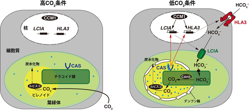 葉緑体に局在するカルシウム結合タンパク質CASは、青丸で示したカルシウムイオンとピレノイド内部で結合し、核における重炭酸イオン輸送体遺伝子( HLA3 と LCIA )の発現を制御するシグナルを伝達する。CCM1は核内で働くCO 2 濃縮の制御因子。CAH3は炭酸脱水酵素