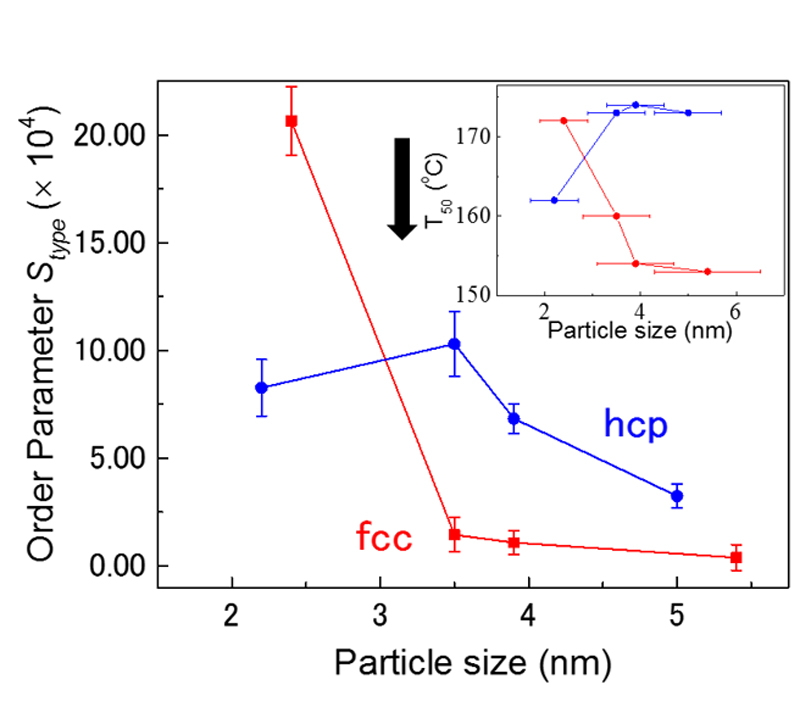 図:面心立方格子構造(fcc)タイプのRuナノ粒子と六方最密充填構造(hcp)タイプのRuナノ粒子の原子スケールの逆モンテカルロ(RMC)モデリングの結果から得られた構造秩序パラメーター(Oeder Parameter)のナノ粒子のサイズとの関係