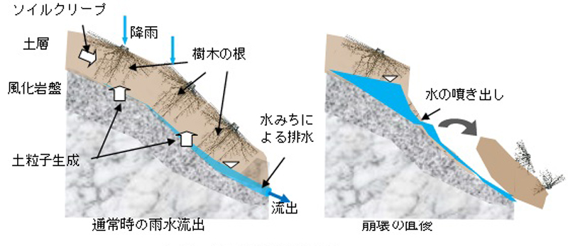 山地斜面の土層は大雨があるとくずれ、大きな災害をもたらし、そのメカニズムを理解することが対策に欠かせません。しかし、土層の崩壊するメカニズムの解明に焦点が当てられ、土層が崩壊後数百年かかって厚く発達してくるのはなぜなのかは、あまり注目されませんでした。