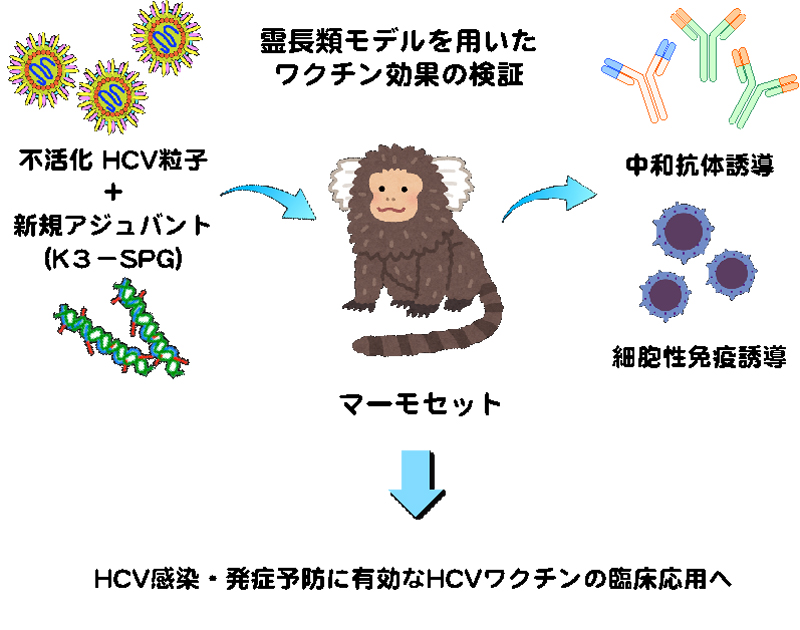 明里宏文 霊長類研究所教授、加藤孝宣 国立感染症研究所室長らの研究グループは、有望なHCVワクチンの開発に成功しました。本研究では、不活化HCV粒子をワクチンの細胞の免疫反応を高める補強剤(以下、アジュバント)であるK3-SPGとともに小型霊長類モデルであるコモンマーモセットに接種したところ、感染・発症予防に有効な中和抗体と細胞性免疫の両方を効率良く誘導できることを初めて明らかにしました。