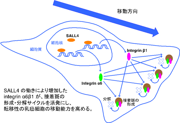 そこで本研究グループは、転移における SALL4の働きを調べるために、転移性乳がんの細胞株でSALL4 の発現抑制実験を行いました。その結果、SALL4が転移性乳がんの移動能力を高めていることが分かりました。そして、SALL4に制御され細胞移動に関わる遺伝子の探索を行ったところ、integrin α6遺伝子とintegrin β1遺伝子をつきとめました。