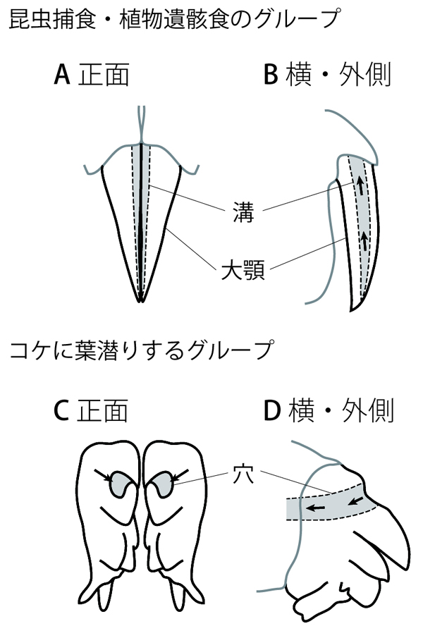 (C-D) コケに潜葉するシトネアブ類の幼虫の大顎