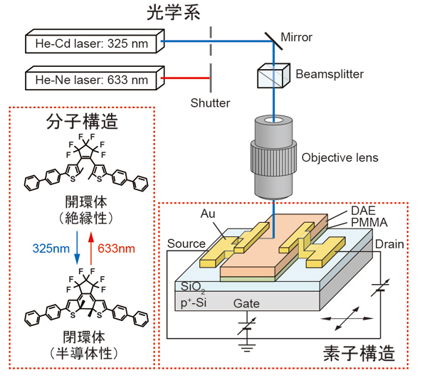 分子はジアリールエテン中心骨格の両側にビフェニル基が取り付けられており、開環体では絶縁体、閉環体では半導体の性質を示す。まず開環体(絶縁体)の薄膜をSiO 2 /Si基板上に作製し、その両側にソース・ドレイン電極を取り付けた。Si基板がゲート電極、SiO 2 膜がゲート絶縁層としてはたらく。ここに紫外光(波長325nm)を掃引して、閉環体(半導体)に異性化したところだけ、トランジスタチャネルとして電流が流れる。再度、可視光(波長633nm)を照射するとチャネルは消去できる。