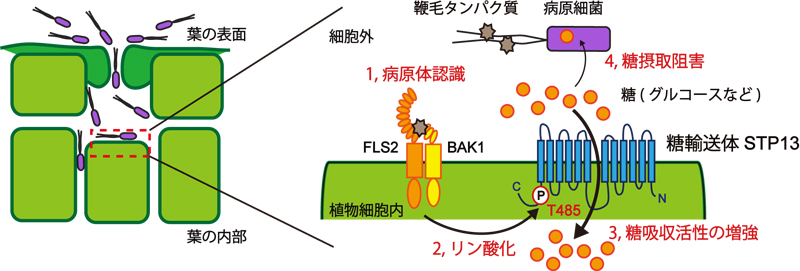 (1)植物細胞は気孔から葉の内部に侵入してきた病原細菌を認識し防御応答を発動する。(2)糖輸送体(糖トランスポーター)STP13の485番目のスレオニン残基 (T485) がリン酸化される。(3)リン酸化を介してSTP13の糖吸収活性が強まることで細胞外の糖含量が減少し、(4)病原体の糖摂取が阻害される。