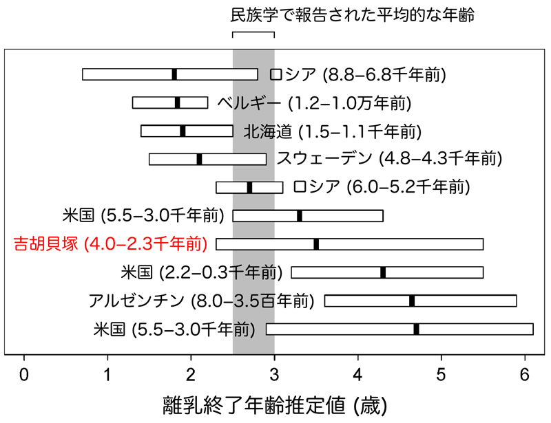 そこで本研究グループは、縄文時代後晩期にあたる吉胡貝塚から出土した子供の骨に安定同位体分析という手法を適用し、離乳年齢を復元しました。授乳期間中は子供の骨に含まれる窒素同位体( 15 N)の割合が増えるという特徴を手掛かりにしたところ、吉胡貝塚のもっとも確率の高い離乳時期は3歳6ヶ月頃でした。この結果を世界の他の地域・時代の狩猟採集民の離乳の終わりの年齢と比較すると、吉胡貝塚の縄文人の離乳年齢はむしろ遅めだということが分かりました。