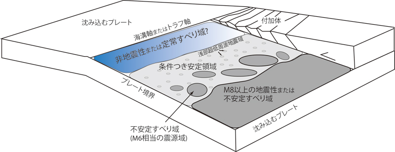 図:南海トラフ域の沈み込むフィリピン海プレート境界面の性質を表す模式図