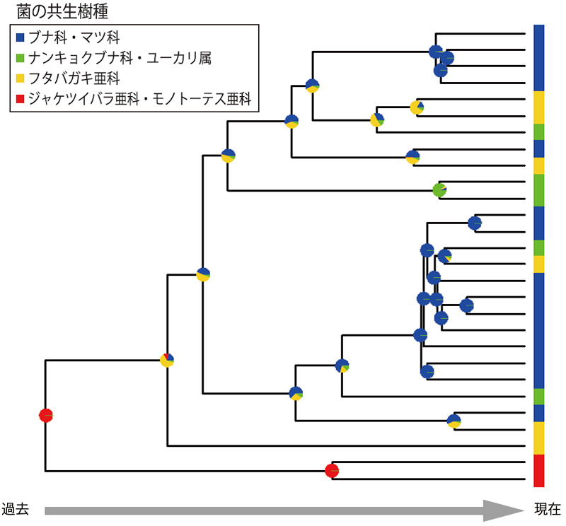 分子系統樹の末端の色分けは現存種の共生樹種を示している。分子系統樹の円グラフは祖先種がどの樹種と共生していたかの可能性を示している。分子系統樹の横方向の長さは時間の経過を示している。