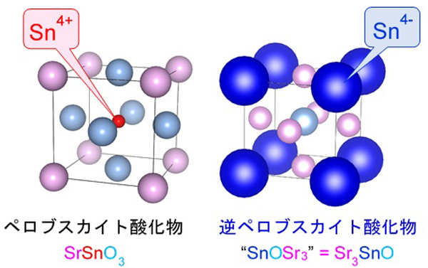 図:左は通常のペロブスカイト酸化物SrSnO 3 。右はマイナス金属イオンSn 4– を含む逆ペロブスカイト酸化物SnOSr 3 (Sr 3 SnOとも書ける)で、本研究で超伝導を発見した。
