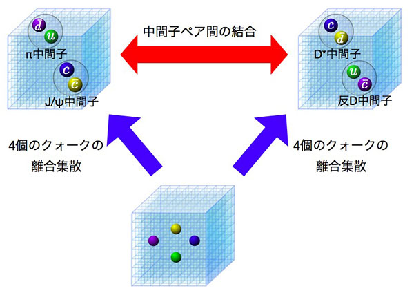 格子量子色力学を用いた大規模数値シミュレーションにより、4個のクォークの離合集散を測定することで、π中間子(アップと反ダウン)とJ/ψ中間子(チャームと反チャーム)間に働く力、反D中間子(アップと反チャーム)とD * 中間子(チャームと反ダウン)の間に働く力、およびこれらの中間子ペア間の結合を計算する。