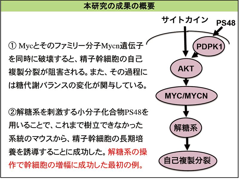本研究グループは、今回Mycとそのファミリー分子であるMycn遺伝子を同時に破壊することで、これらの遺伝子による精子幹細胞の糖代謝バランスの維持が自己複製分裂の制御に重要な役割を果たすことを見出しました。