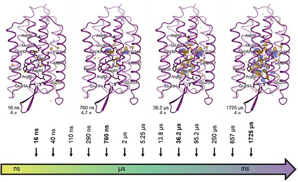 タンパク質が光で反応を開始してから、ナノ秒からミリ秒における13時点でタンパク質の構造変化を追跡した。得られた構造を解析したところ、主に4種類の中間体構造をとることがわかった。紫色のリボンで描かれた部分はタンパク質の主鎖を示す。構造の内部の青と黄色の部分は動く前の構造と比べて変化が起きたことを示し、黄色の部分にあった原子が青色の部分に移動したことを意味する。