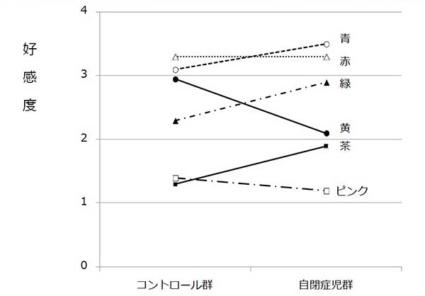 図:自閉症スペクトラム児とコントロールにおける六つの色の好感度の比較