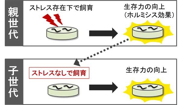 西田栄介 生命科学研究科教授、岸本沙耶 同博士課程学生、宇野雅晴 同特定研究員らの研究グループは、親世代に低用量ストレスを与えることで獲得されるホルミシス効果(ストレス耐性の上昇や寿命の延長)が、数世代にわたって子孫へと受け継がれることを発見しました。