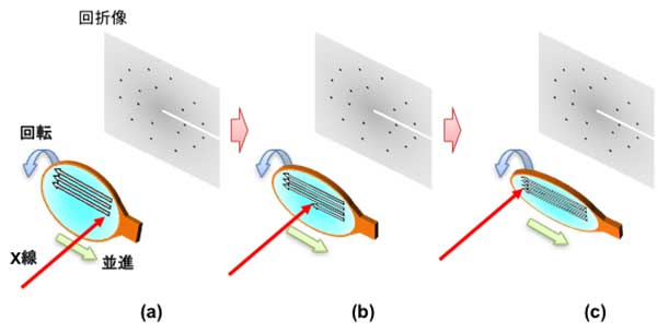 樹脂製の直径約1mmの楕円形をしたサンプルループ(茶色)にすくい上げた目的の微小結晶懸濁液(水色)を、緑矢印方向に並進、青矢印方向に回転させながらX線(赤矢印)を照射する。照射はサンプルループの右端から開始され(a)、左端で終了する(c)。その後、サンプルループを縦方向にずらし、次の行に対して同様のX線照射を行う。これを一つの試料あたり数十回繰り返す。すると、サンプルループ中の微小結晶に網羅的にX線を照射することになり、効率のよい回折データ測定が可能となる。