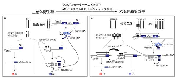 二倍体種ではY染色体を持つ個体は必ず雄花のみを着生する雄株となるが、栽培ガキではY染色体を持っていても OGI が不安定化しており、 MeGI のDNAメチル状態の影響が卓越的になり、雄花・雌花への運命が決定する。