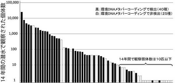 縦軸は14年間の調査で観察された各魚種の個体数。黒い棒グラフは環境DNAメタバーコーディングでも検出された種(40種)、白い棒グラフは検出されなかった種(25種)。目視調査では80種を観察しているが、現在のメタバーコーディング技術では仕組み上検出できない種を除いて、65種でグラフを作成した。