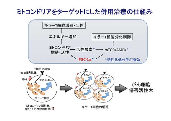本研究グループは、活性酸素(ROS)発生剤をPD-1阻害抗体と併用すると、PD-1阻害抗体による抗腫瘍効果が増強されることを発見しました。その過程で、ROSはT細胞のエネルギー制御に重要なmTORとAMPKをそれぞれエフェクターとメモリーT細胞で活性化し、それぞれの下流に共通に存在するPGC-1aを活性化させることを解明しました。PGC-1aはミトコンドリアの活性化に非常に重要な役割を果たしています。PGC-1aを活性化する低分子化合物ベザフィブラートはキラーT細胞内のミトコンドリア由来エネルギーを増大させ、PD-1阻害抗体の腫瘍抑制効果を増強することも証明しました。ベザフィブラートは高脂血症の薬としてすでに臨床で使用されているため、本薬剤とニボルマブとの併用治療の臨床治験を計画しています。