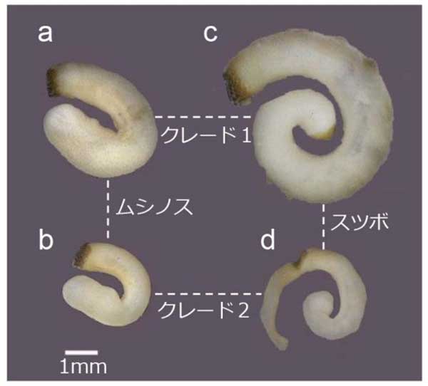 クレード1(a、c)とクレード2(b、d)のホシムシ。aとbはムシノスチョウジガイに、cとdはスツボサンゴにそれぞれ共生していたもの。同じクレードに属するホシムシでも、どちらのサンゴに共生するかによってずいぶんと形が違う。
