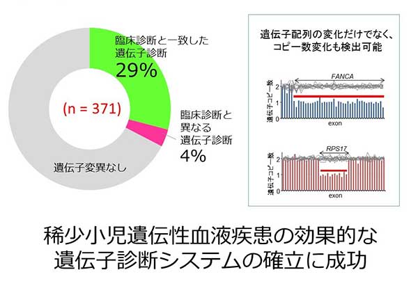 そこで本研究グループは、次世代シーケンサーという新たな機器を用いて、小児遺伝性血液疾患の原因となる100以上の遺伝子を一度に解析が可能となる、遺伝子診断システムを構築しました。実際の患者の検体を用いて検討を行ったところ、解析した371人のうち、33%に当たる121人の患者の遺伝子診断を確定できました。また、遺伝子診断が得られた患者の約1割では、主治医が考えた診断(臨床診断)と遺伝子診断が一致しないことが明らかとなり、この検査が小児遺伝性血液疾患の正確な診断に貢献する可能性が示されました。