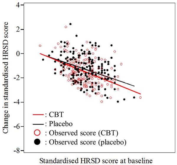 Toshi A. Furukawa, Erica S. Weitz, Shiro Tanaka, Steven D. Hollon, Stefan G. Hofmann, Gerhard Andersson, Jos Twisk, Robert J. DeRubeis, Sona Dimidjian, Ulrich Hegerl, Roland Mergl, Robin B. Jarrett, Jeffrey R. Vittengl, Norio Watanabe and Pim Cuijpers. (2017). Initial severity of depression and efficacy of cognitive–behavioural therapy: individual-participant data meta-analysis of pill-placebo-controlled trials. The British Journal of Psychiatry.