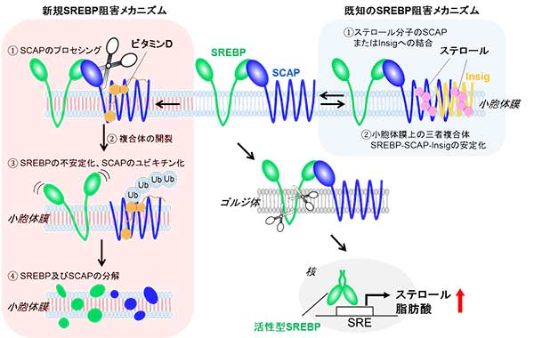 そこで本研究グループは、脂質生合成の指令塔である転写因子(DNA上の特定の塩基配列に結合し、DNAからRNAへの転写の過程を促進または抑制する働きを持ったタンパク質の一群)であるSREBP(Sterol Regulatory Element-binding Protein)に着目し、ビタミンD代謝物がSREBPの活性を調節していることを新たに発見しました。そのメカニズム解析を進めたところ、これまで知られていなかった方法でビタミンDがSREBPの働きを抑えていることが分かりました。