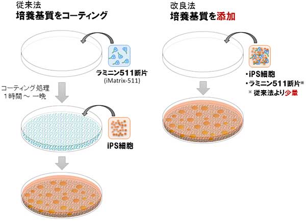 ヒト胚性幹(ES)細胞や人工多能性幹(iPS)細胞のような多能性幹細胞を創薬や細胞治療などに応用するには、非常に多くの数の細胞を生産する必要があります。これら多能性幹細胞を拡大維持するには、培養容器への多能性幹細胞の接着性を高め、生存性を向上させるのに適した培養基質を、容器内にあらかじめコーティングしておく必要があります。多能性幹細胞の維持培養に適した培養基質としては、ラミニン511(多くの細胞が足場としている、α鎖、β鎖、γ鎖から成る三量体タンパク質で、組織外側の境界にある基底膜を構成する成分)の組換えタンパク質断片(商品名:iMatrix-511、ニッピ)、あるいはラミニン521やビトロネクチンが知られていますが、これら培養基質の容器へのコーティングには通常、培養細胞を移し替える(継代)直前に1時間から一晩、緩衝液に溶解させた状態で恒温処理する工程が必要とされます。この工程のため、多能性幹細胞の培養操作には時間と手間を要しました。
